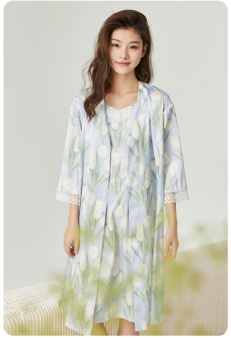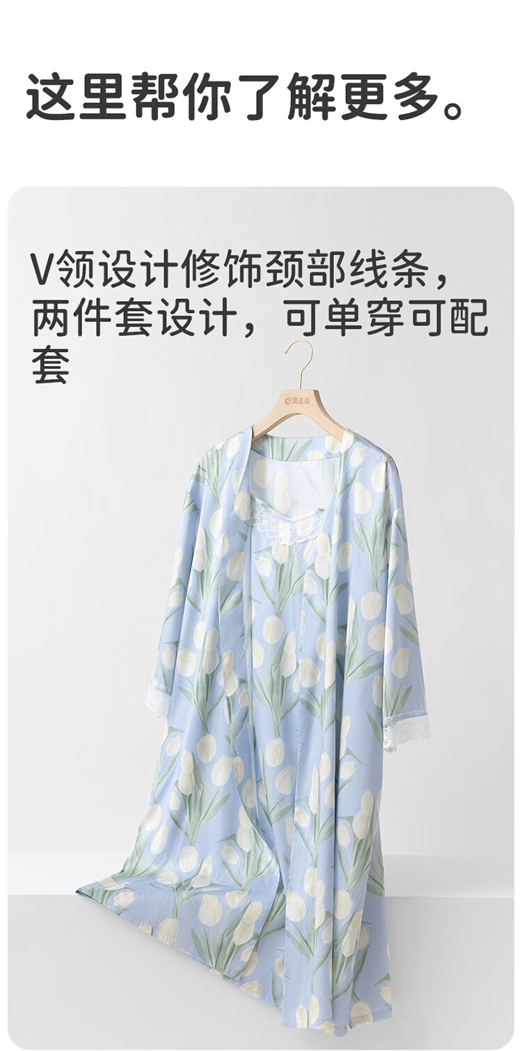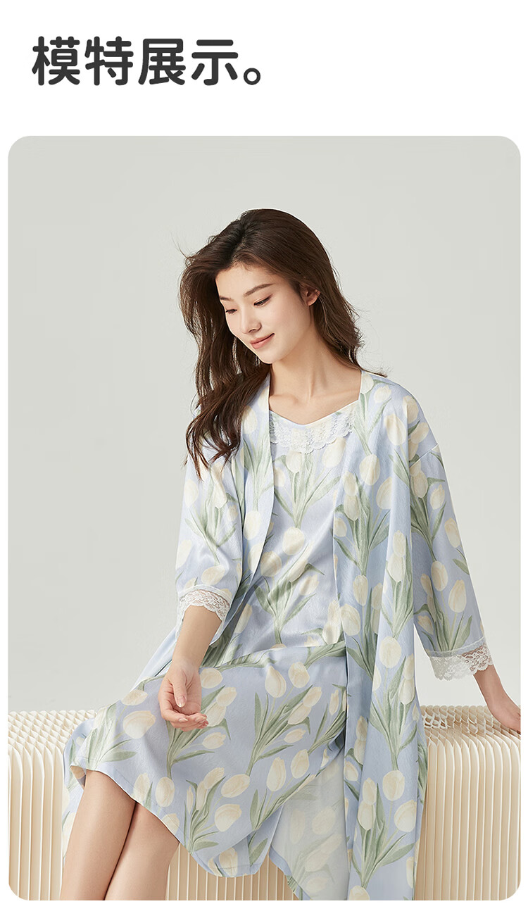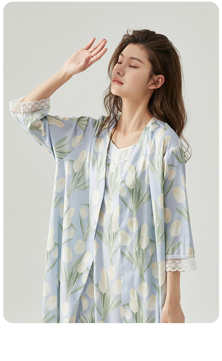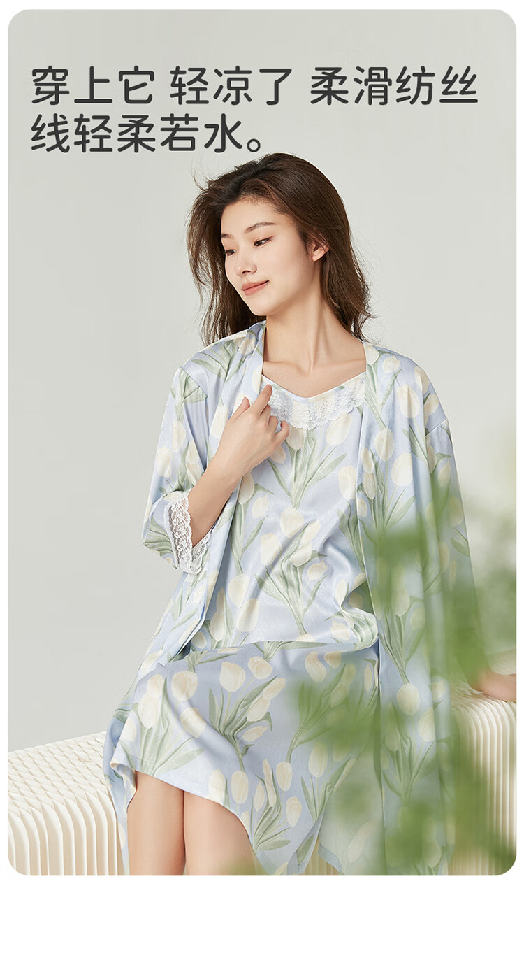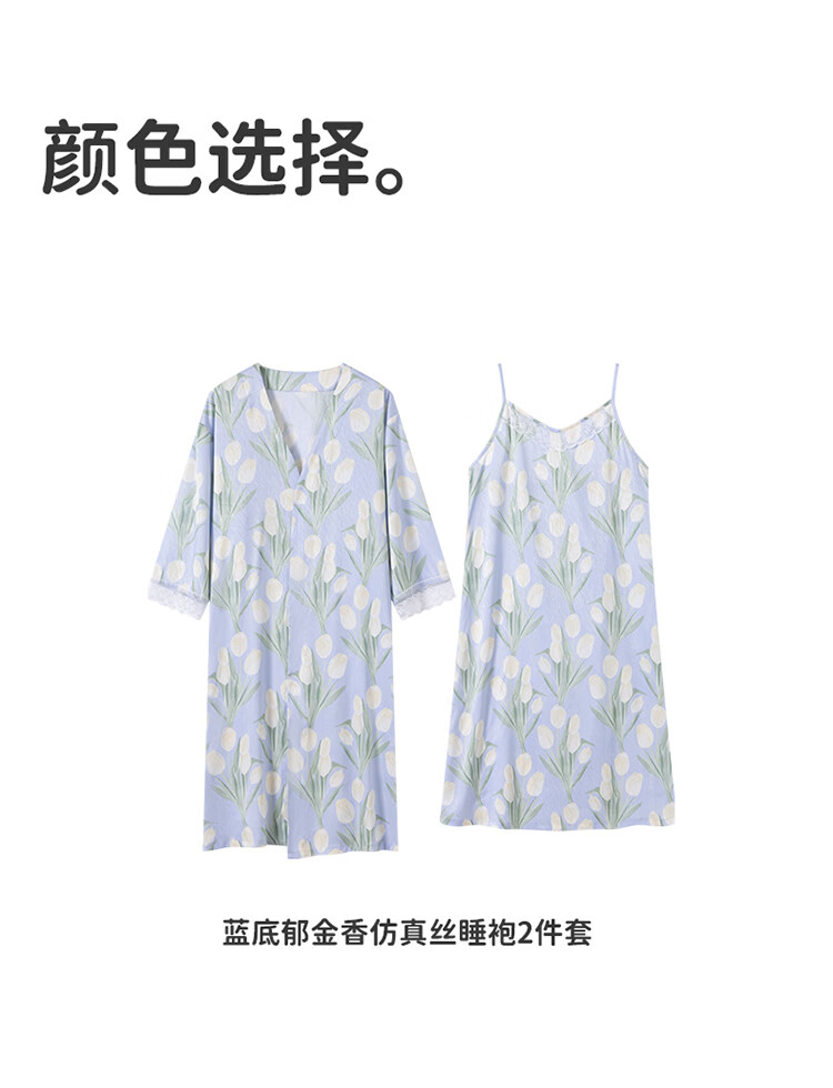 顶瓜瓜【浪漫郁金香 仿真丝睡裙&浴袍】女士柔滑垂顺浴袍两件套睡袍女 蓝底郁金香 2XL (175)