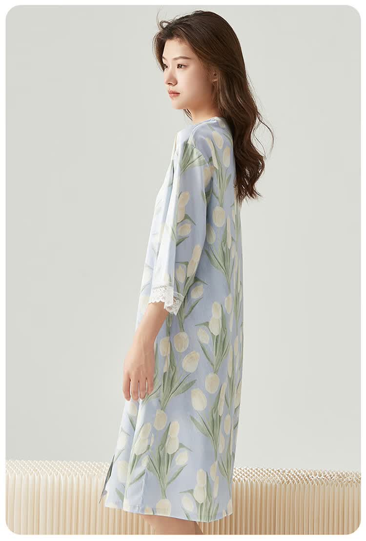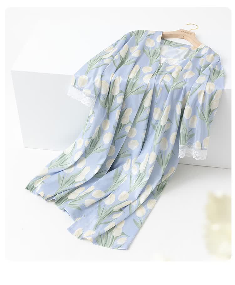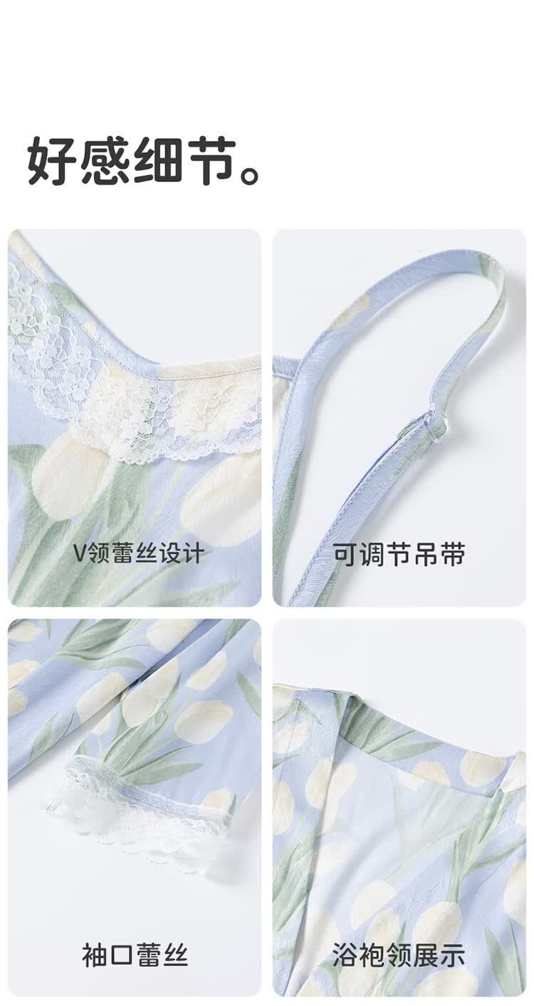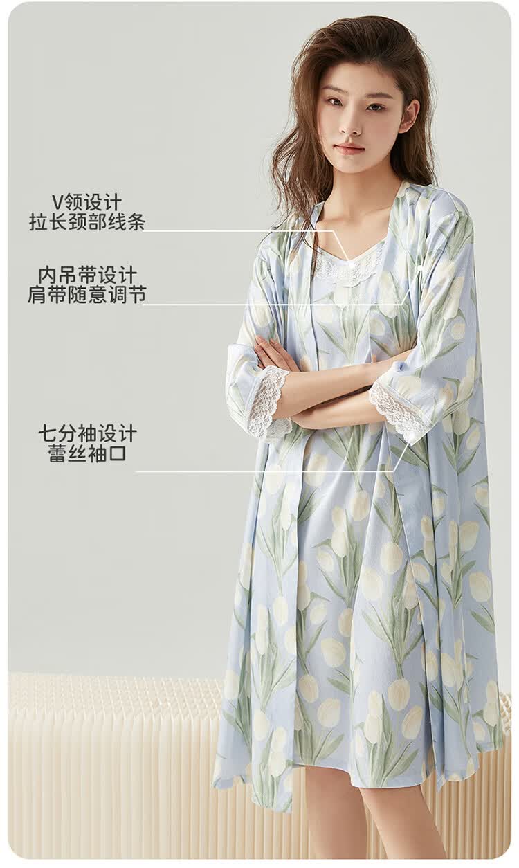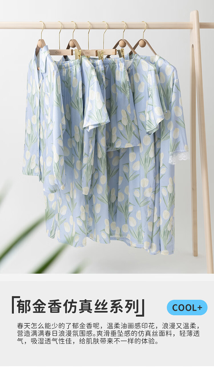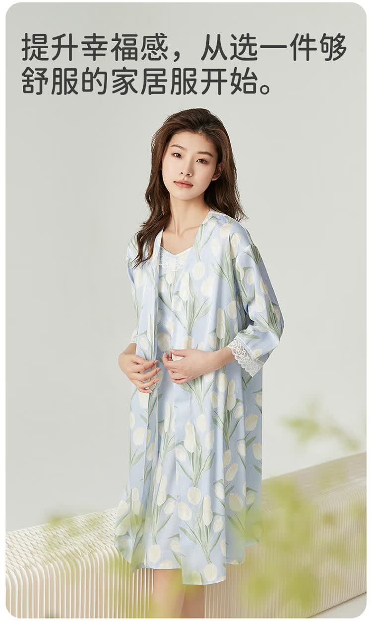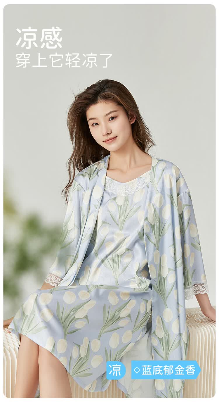 顶瓜瓜【浪漫郁金香 仿真丝睡裙&浴袍】女士柔滑垂顺浴袍两件套睡袍女 蓝底郁金香 2XL (175)