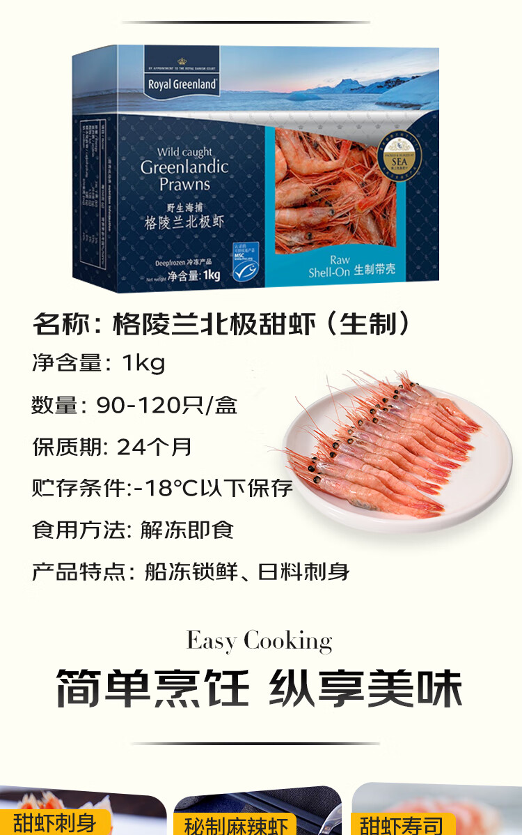 京东超市北极甜虾刺身1kg/盒 90-120只 (MSC认证) 皇家格陵兰 日料刺身