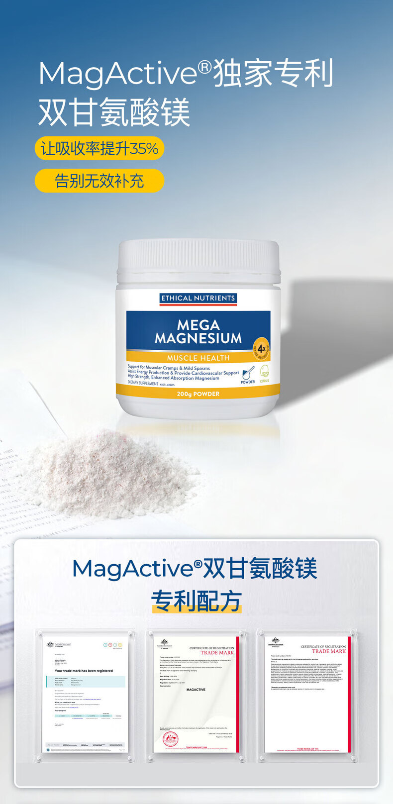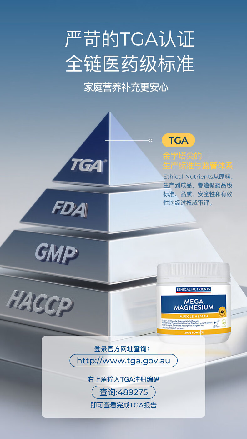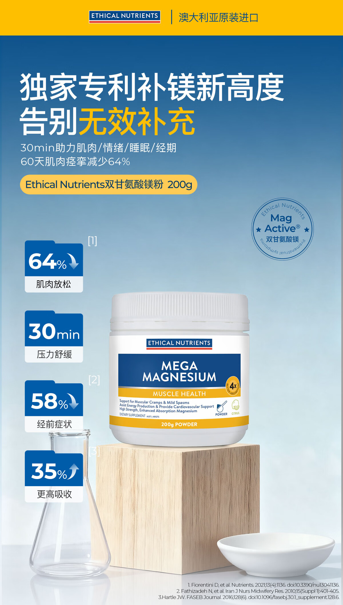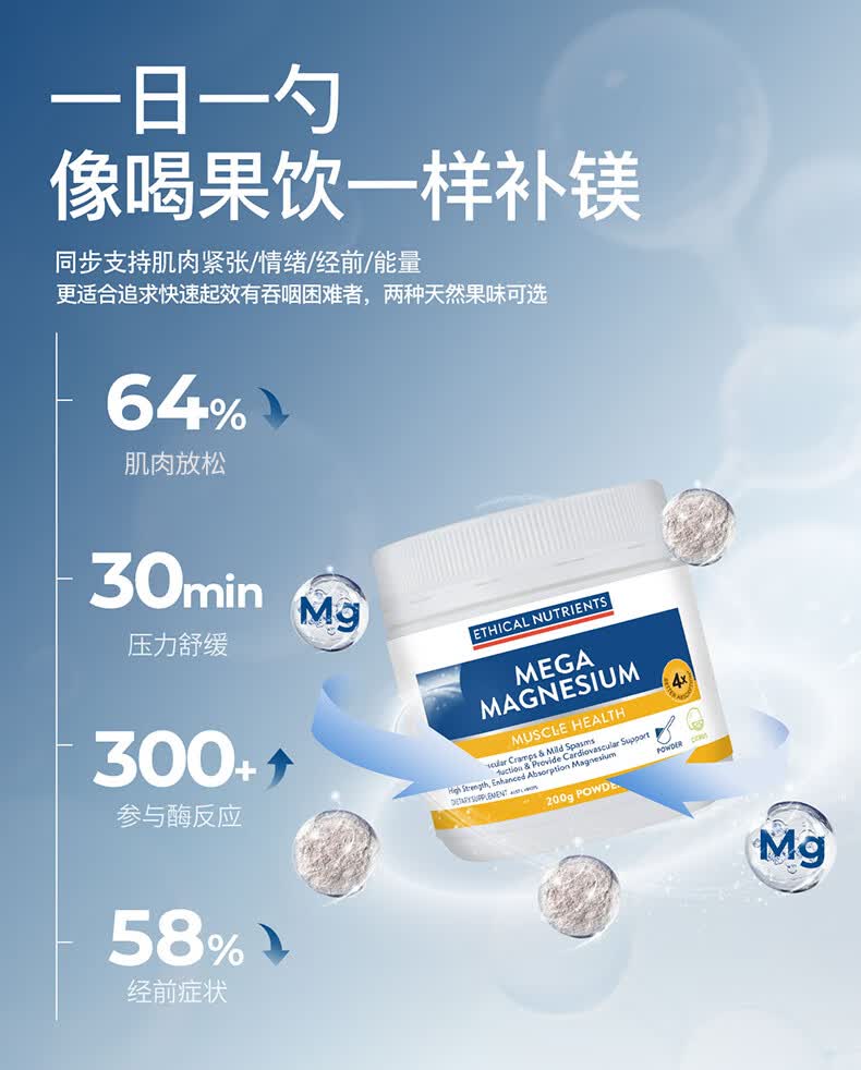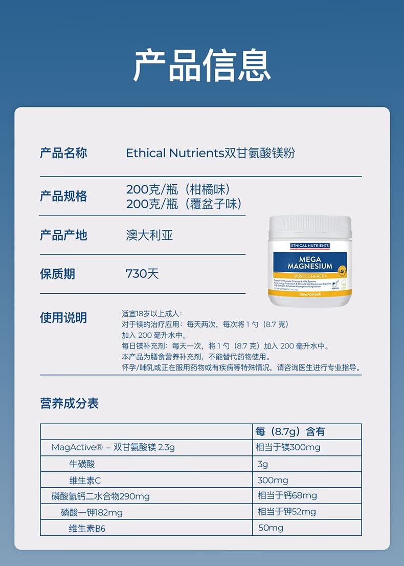 ETHICAL NUTRIENTS澳洲益嘉恩双甘氨酸镁粉改善肌肉紧张PMS放松肌肉 粉剂冲泡柑橘味 200克/瓶 柑橘味