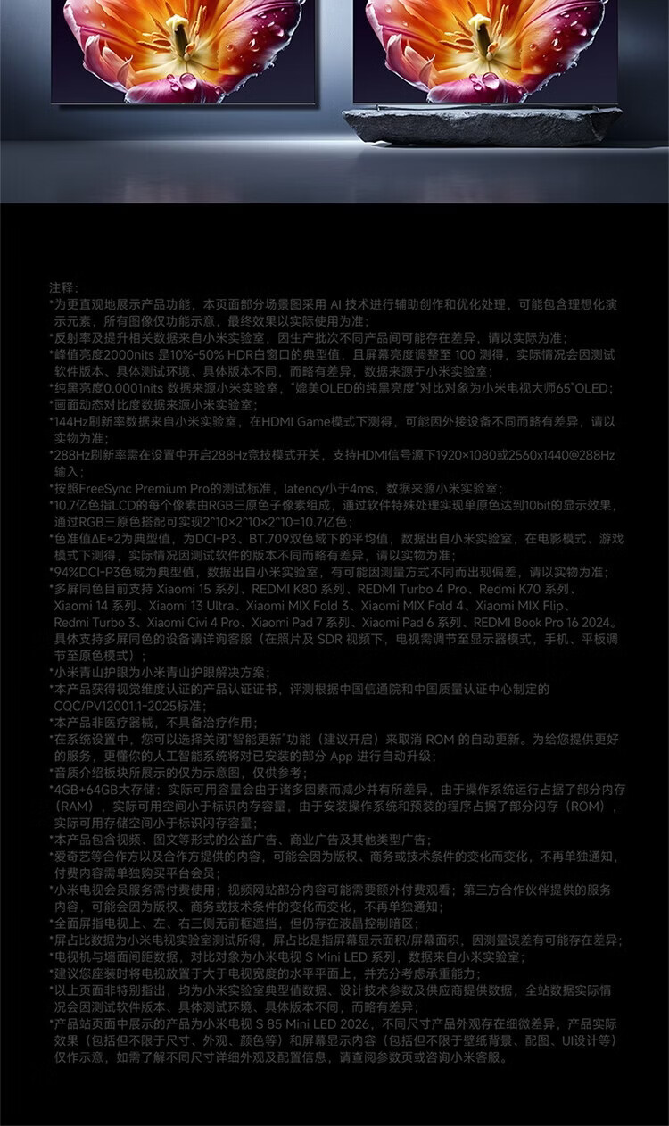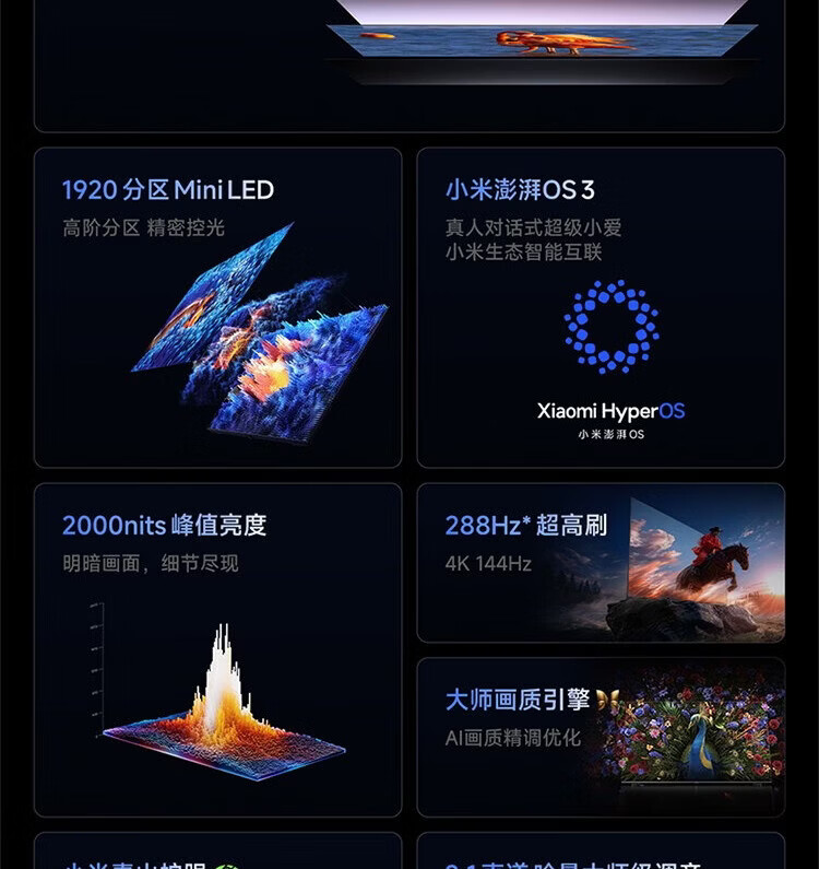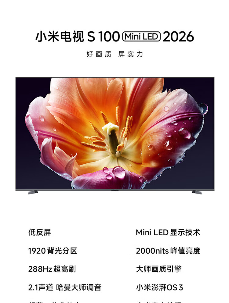 小米(MI)电视S100 Mini LED 2026 100英寸 288Hz 4K 1920分区低反屏 2000nits峰值亮度小米澎湃OS电视机 100英寸 小米电视S100 Mini LED 2026