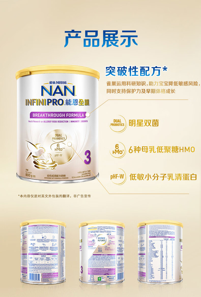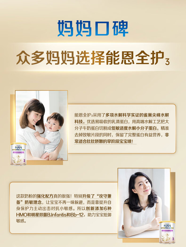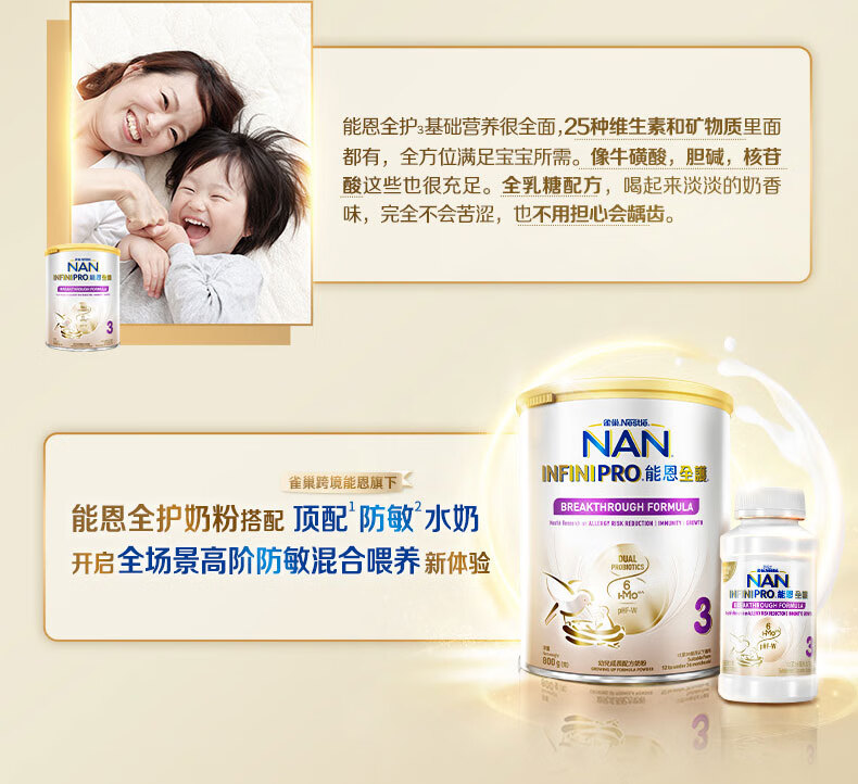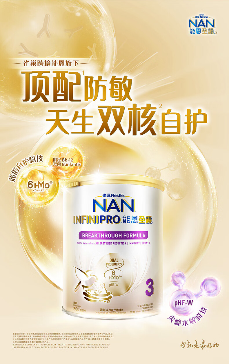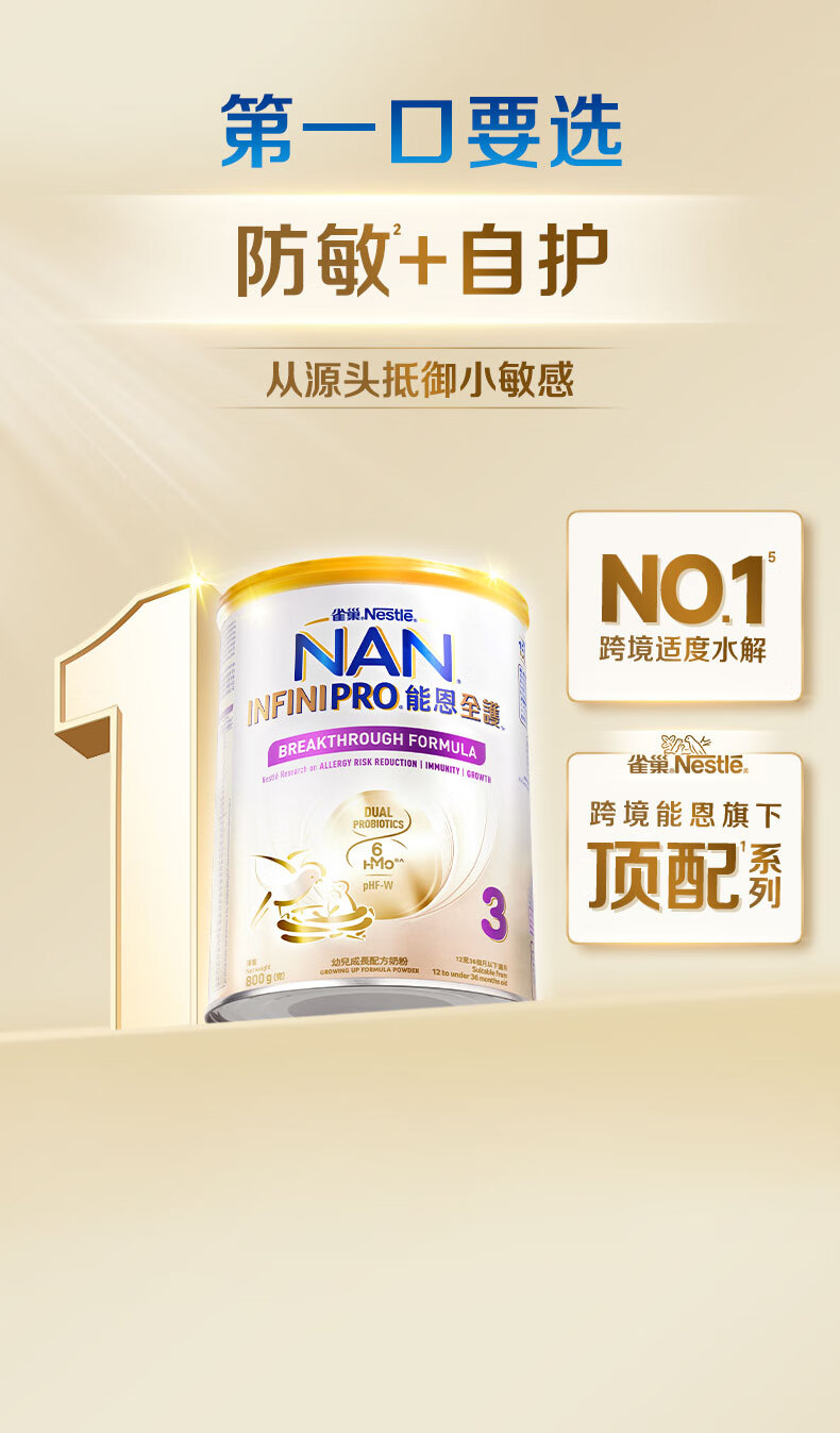 雀巢(Nestle)能恩全护适度水解6HMO婴幼儿奶粉3段800g/罐12-36个月低敏免疫力