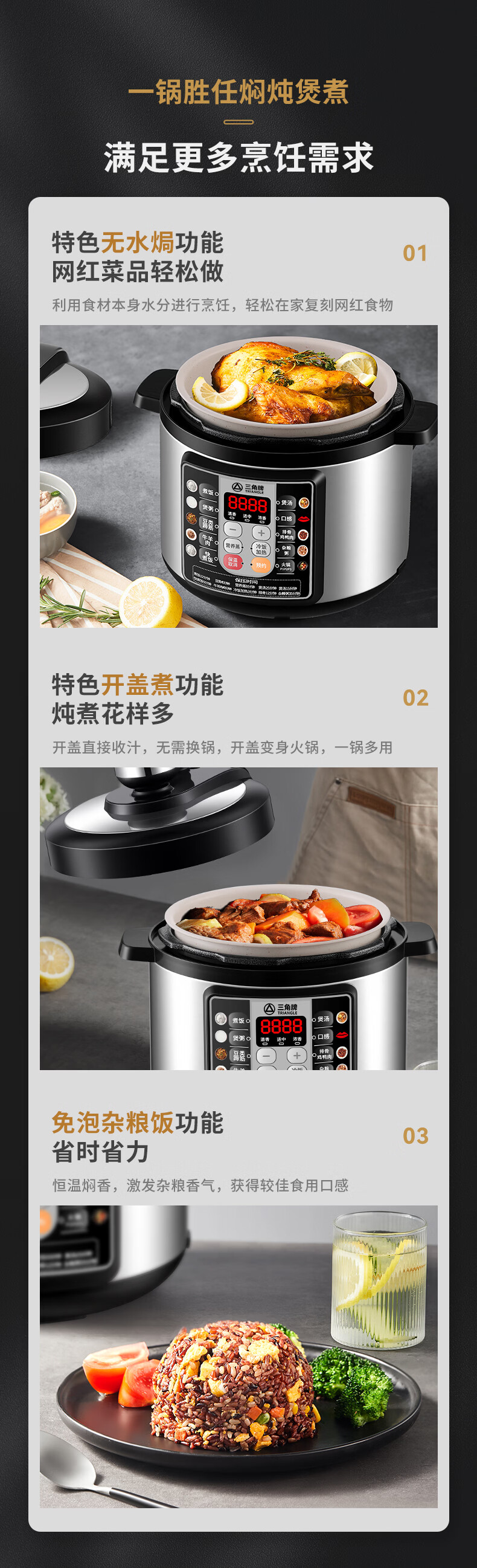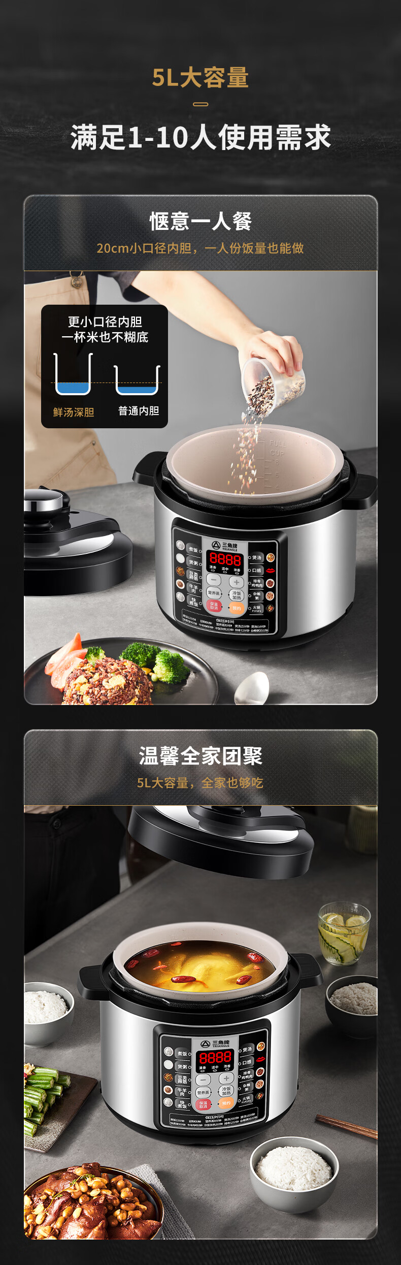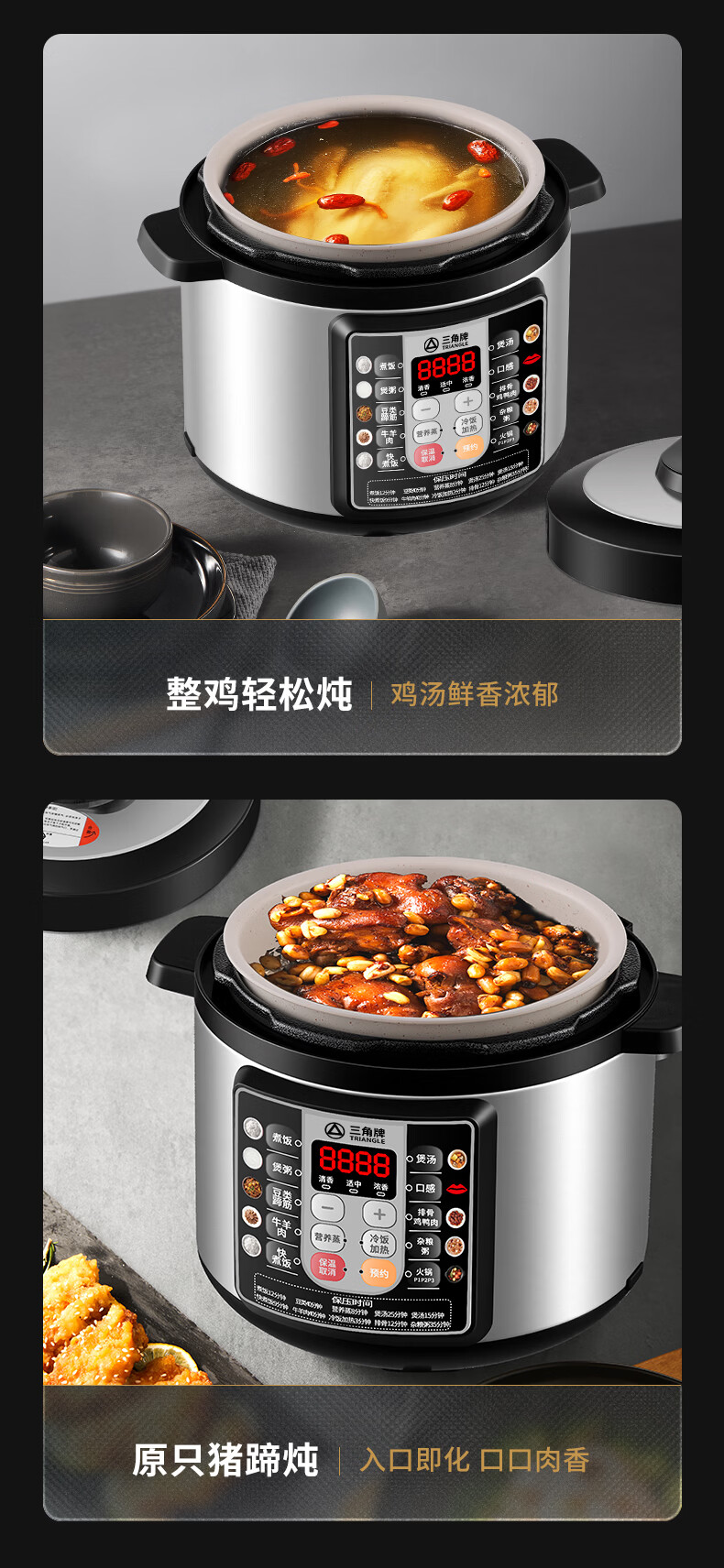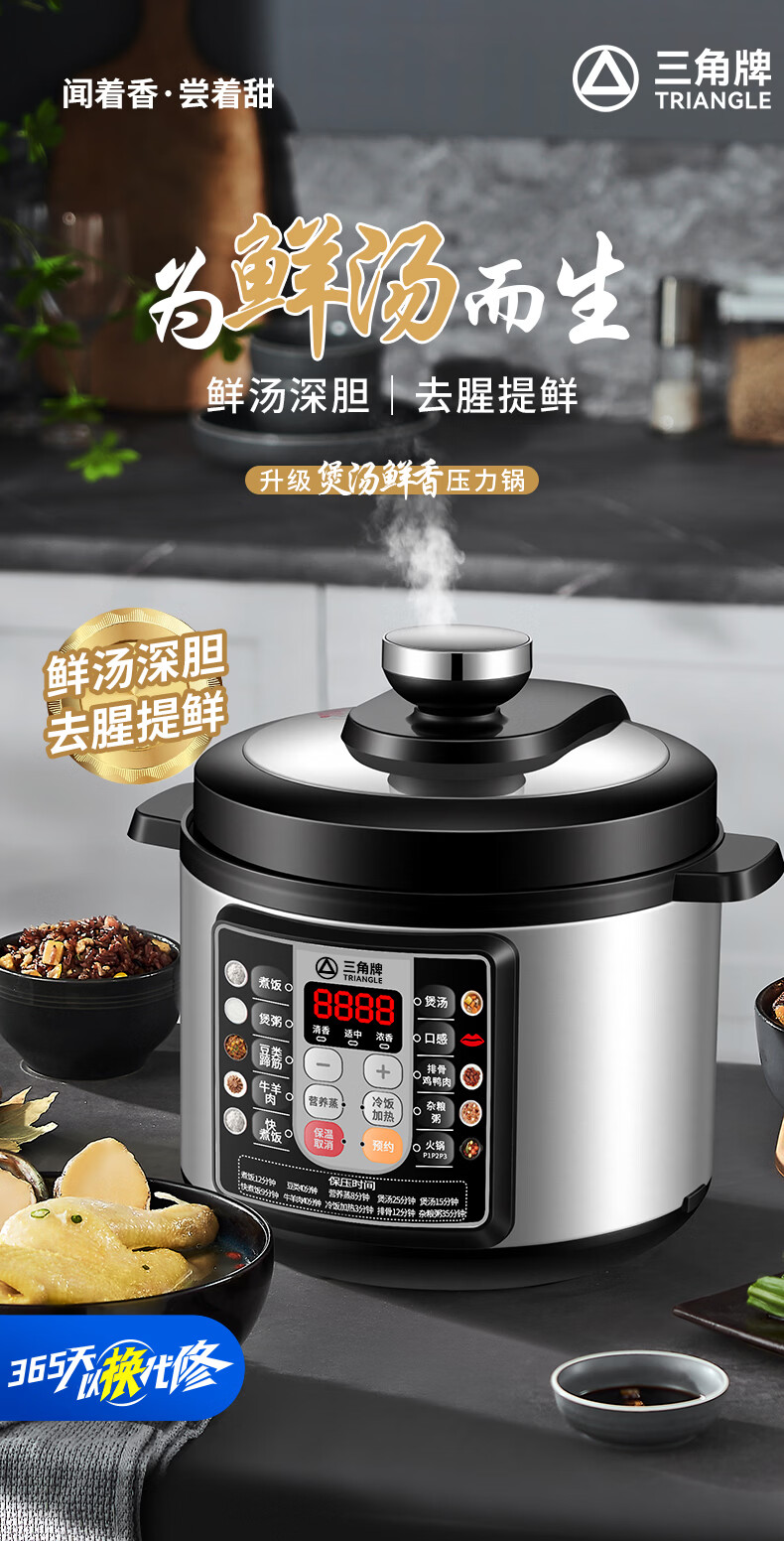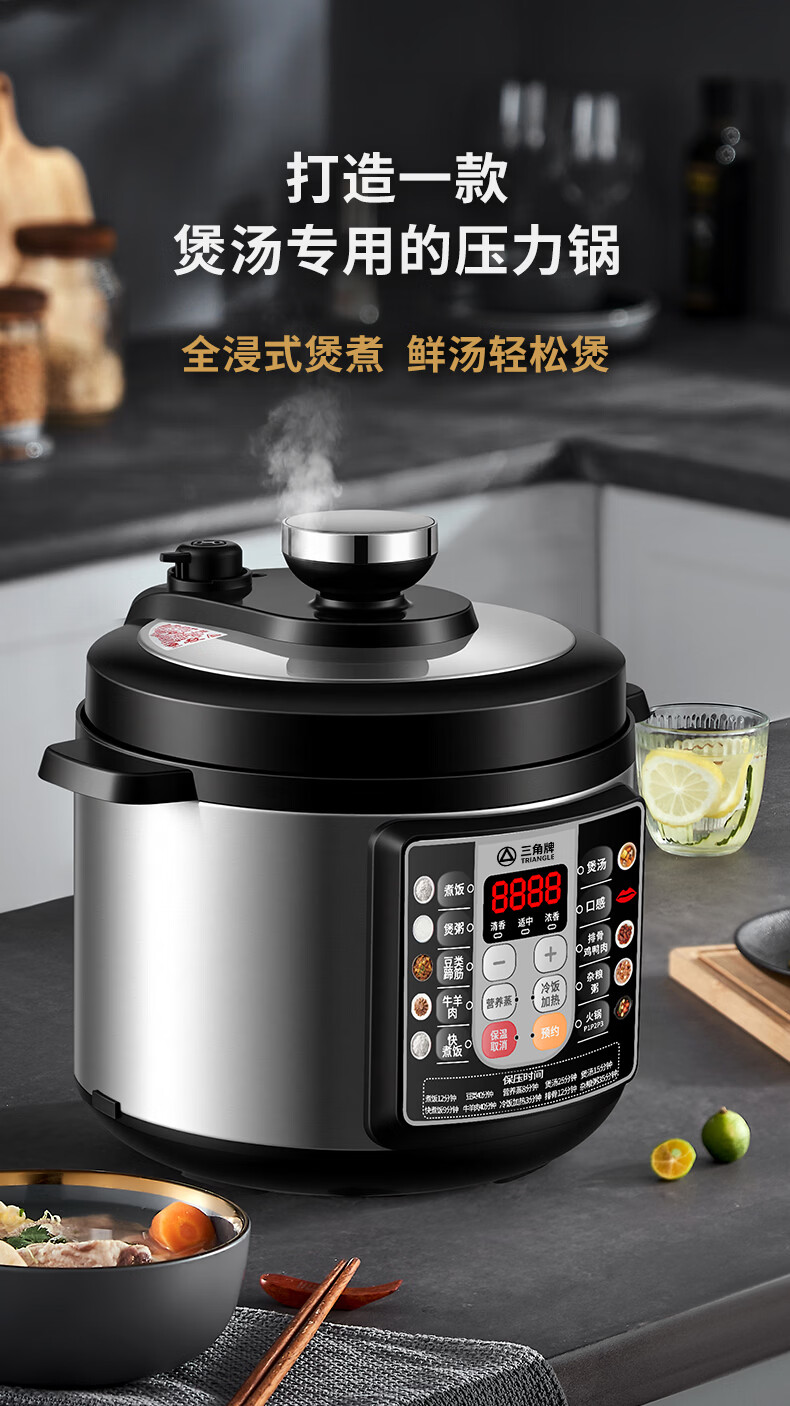 三角牌(Triangle)电压力锅家用2.5-6L智能多功能饭锅24H预约上盖可拆卸煮饭煲汤炖肉高压电饭锅 推荐3-6人【麦饭石胆】 5L