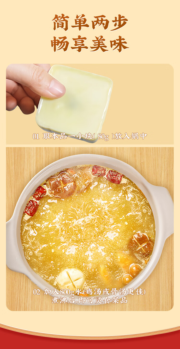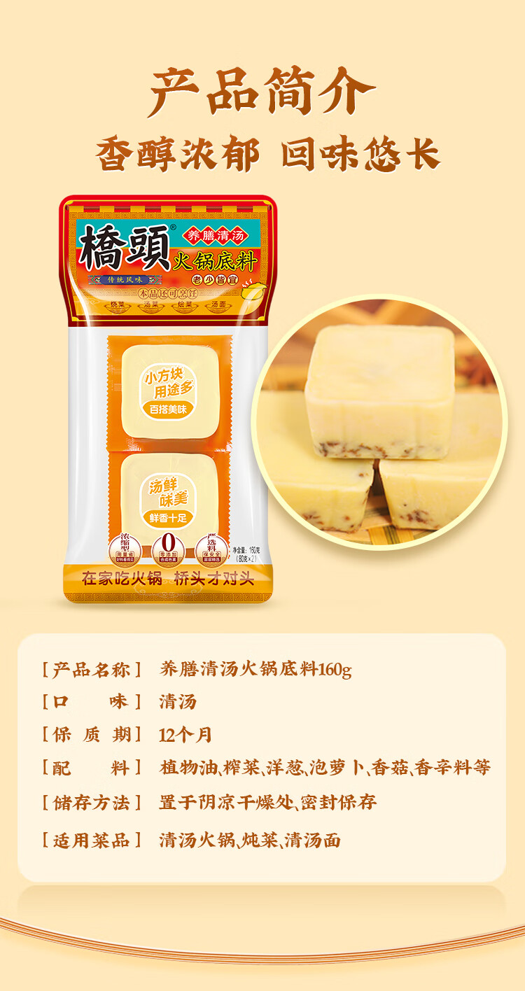 桥头清汤火锅底料养膳清汤不辣160g(80g*2块)独立小块调料包
