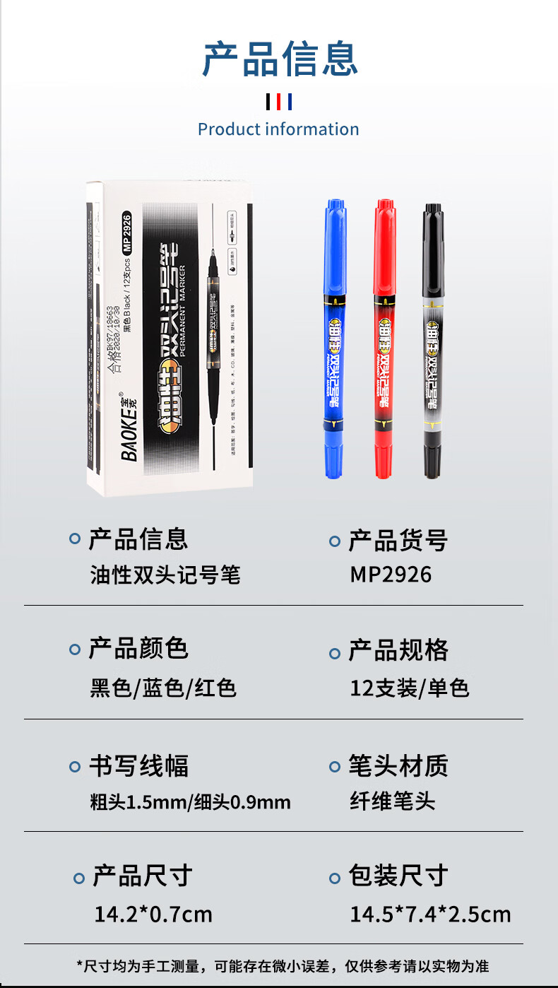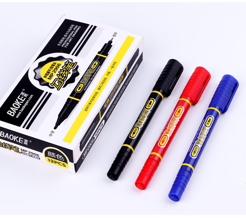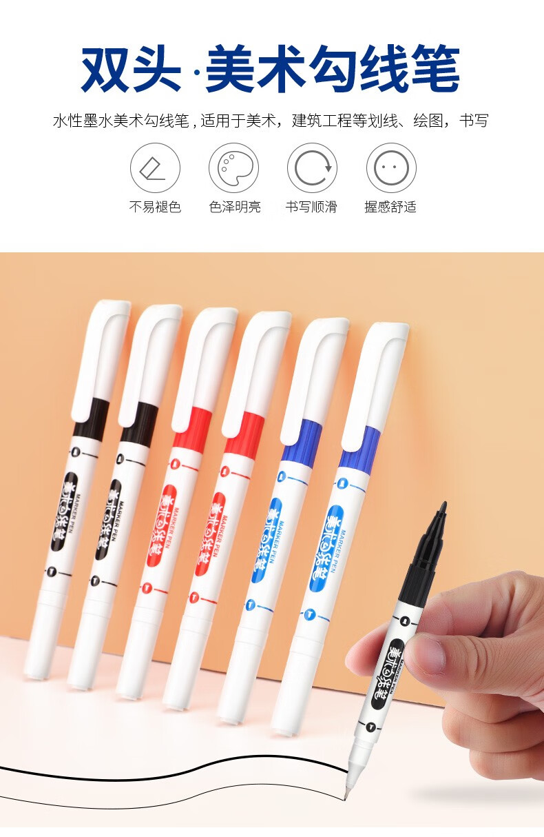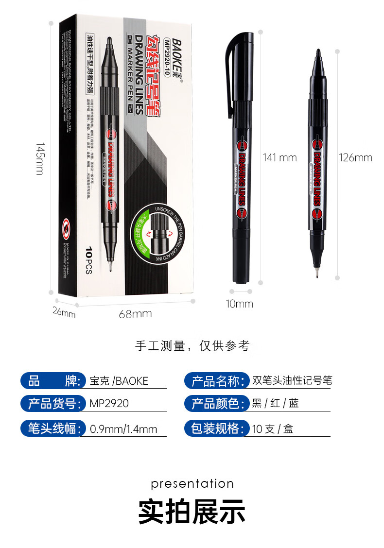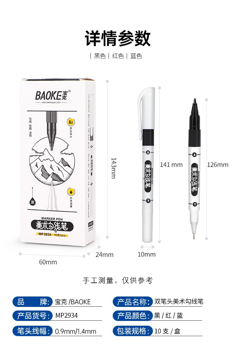 宝克(BAOKE)MP2934 美术勾线笔 大小双头办公记号笔 会议签字笔 学习标记办公文具 黑色【不可加墨款 水性墨水 无气味】 单支体验装