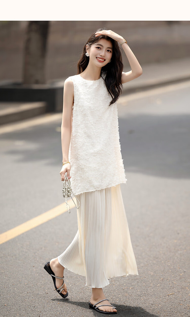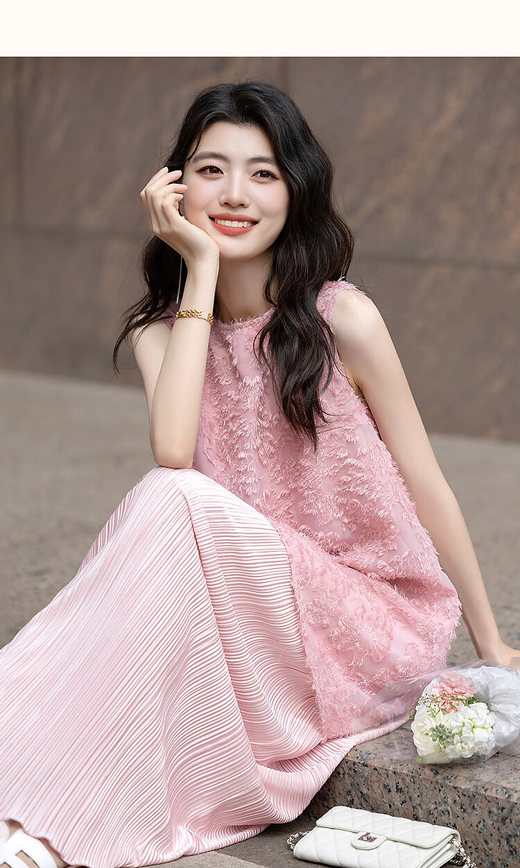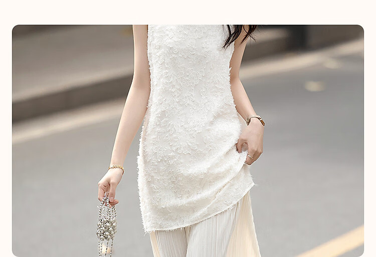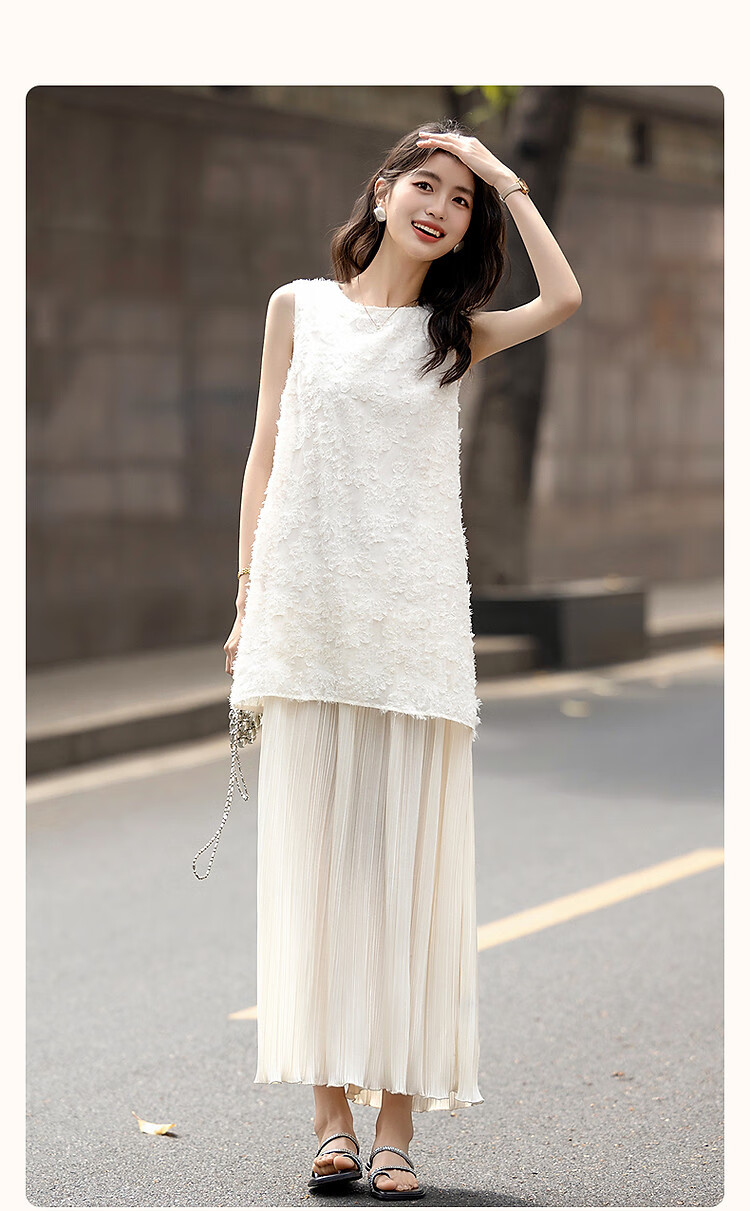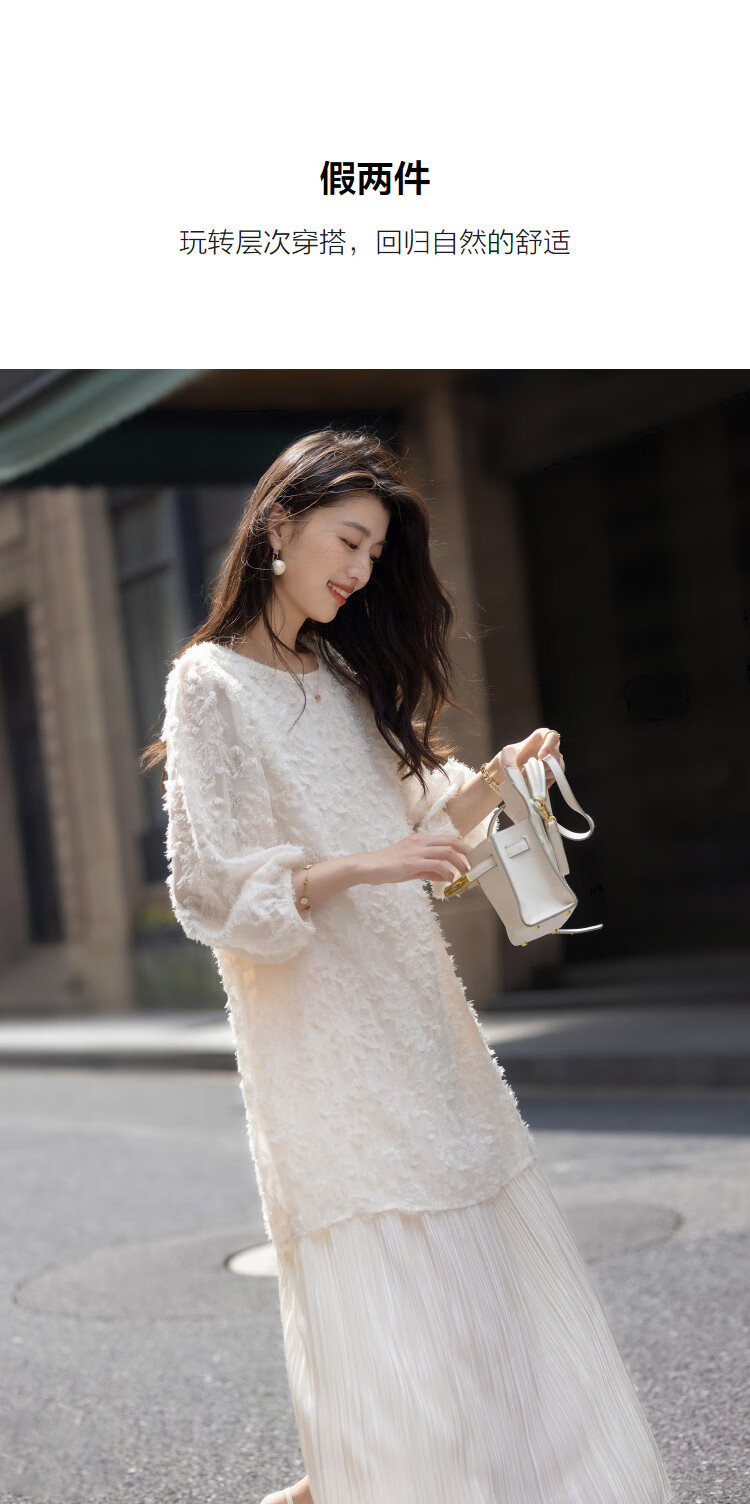 德玛纳【设计感假两件】夏季轻薄慵懒立体剪花无腰线直筒压褶女式连衣裙