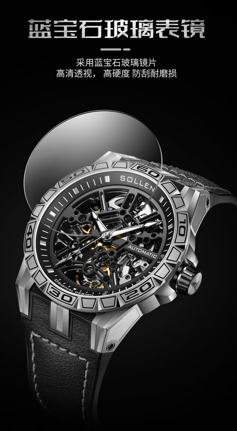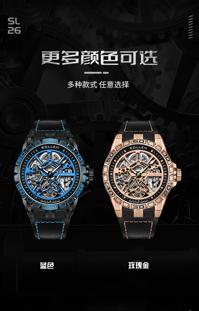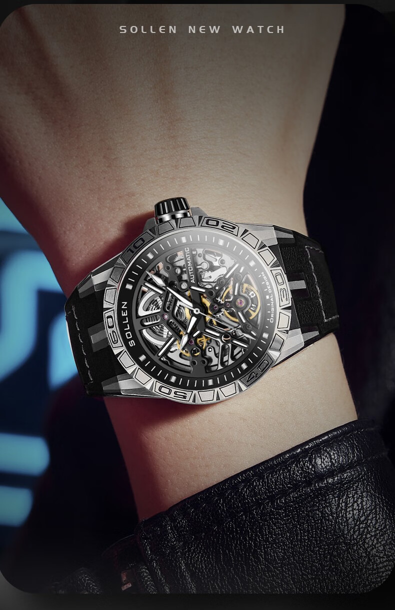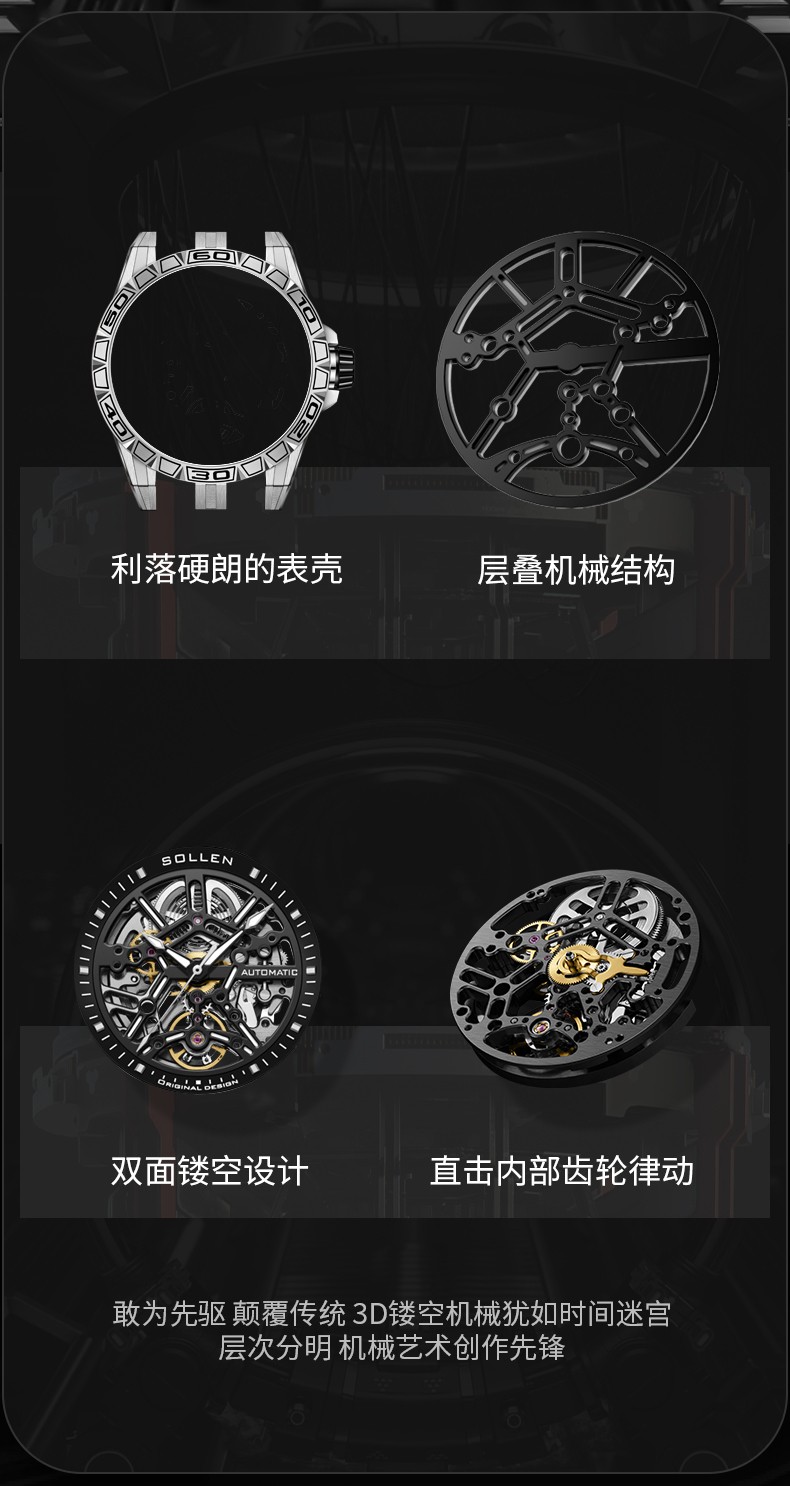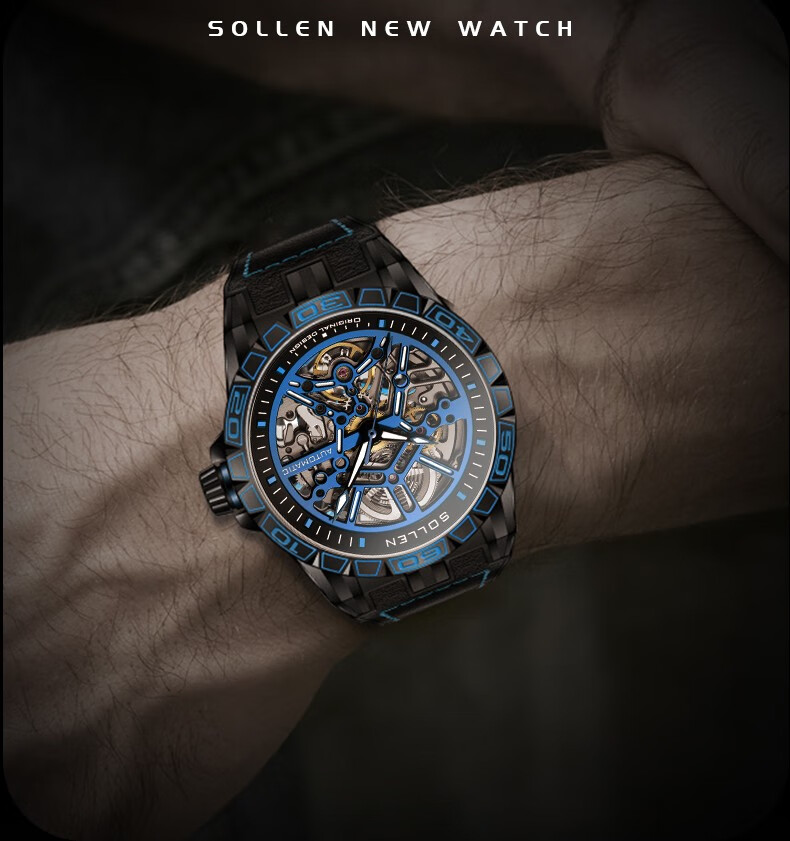 梭伦(SOLLEN)新款迷宫表盘手表男镂空全自动机械表男士手表防水夜光腕表送男友 蓝色黑盘【国潮双开礼盒】326
