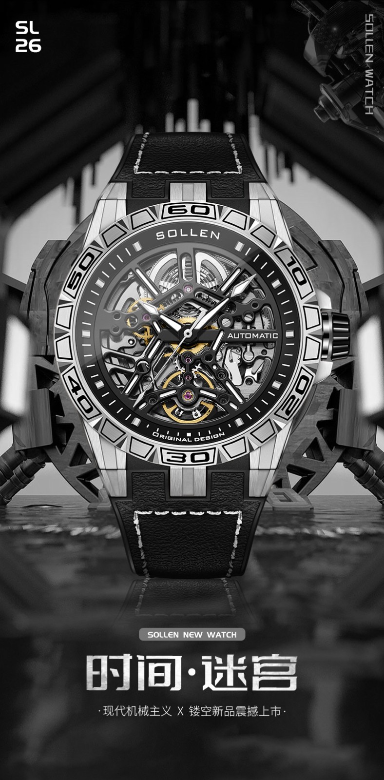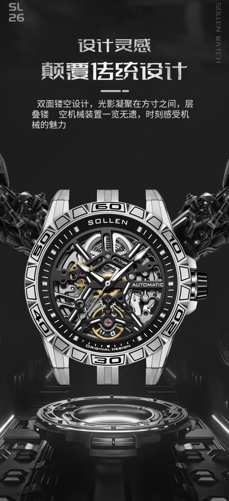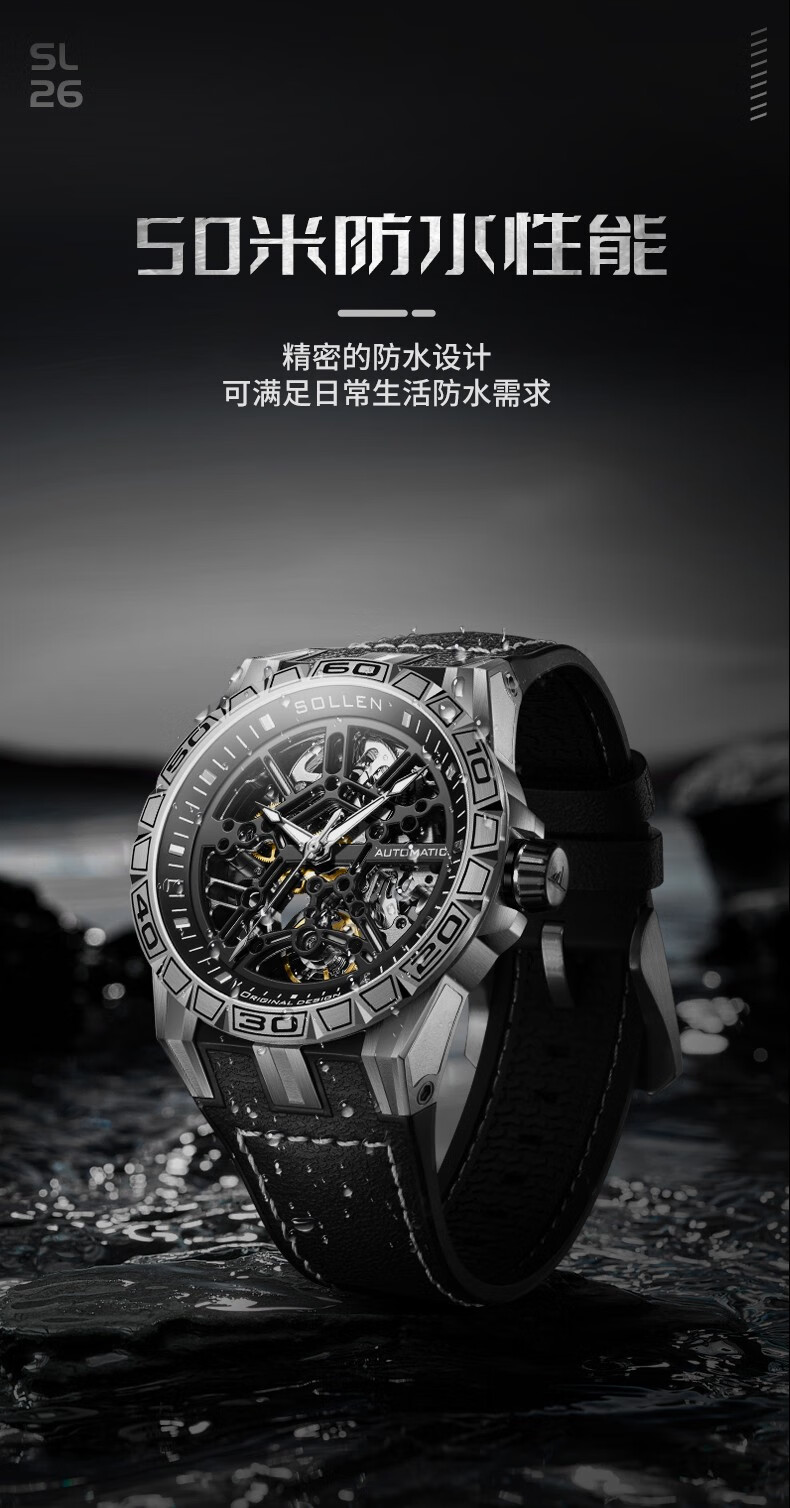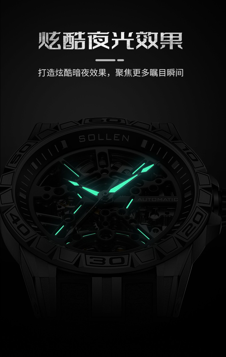 梭伦(SOLLEN)新款迷宫表盘手表男镂空全自动机械表男士手表防水夜光腕表送男友 蓝色黑盘【国潮双开礼盒】326