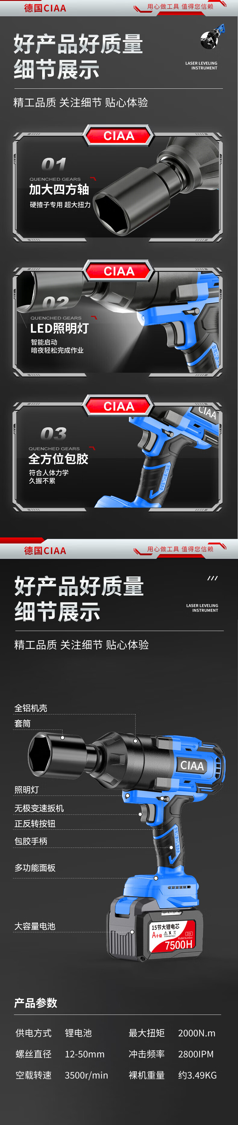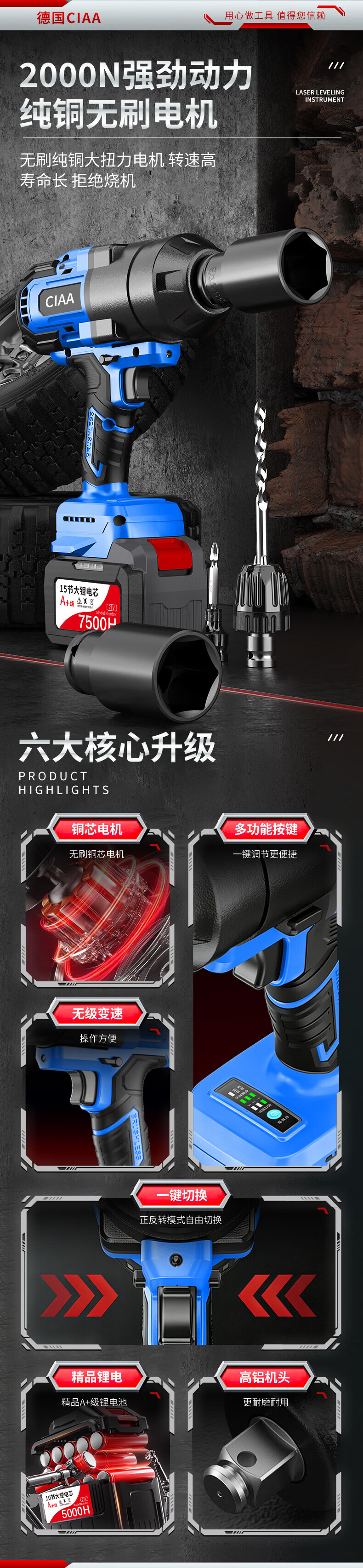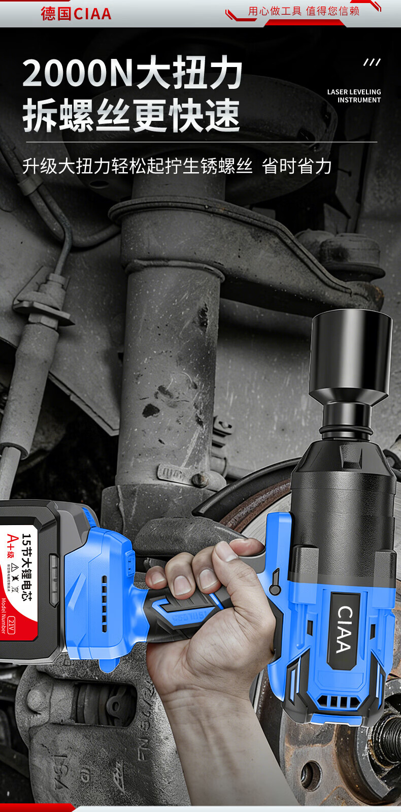 CIAA德国 电动扳手无刷大扭力2000N锂电冲击风炮重型工业汽修拆卸专用 2000N大扭矩【一块10节5000H电池】 赠防摔塑箱