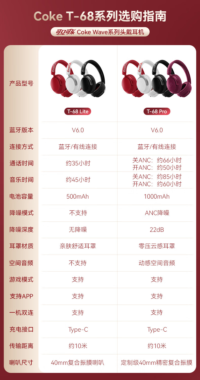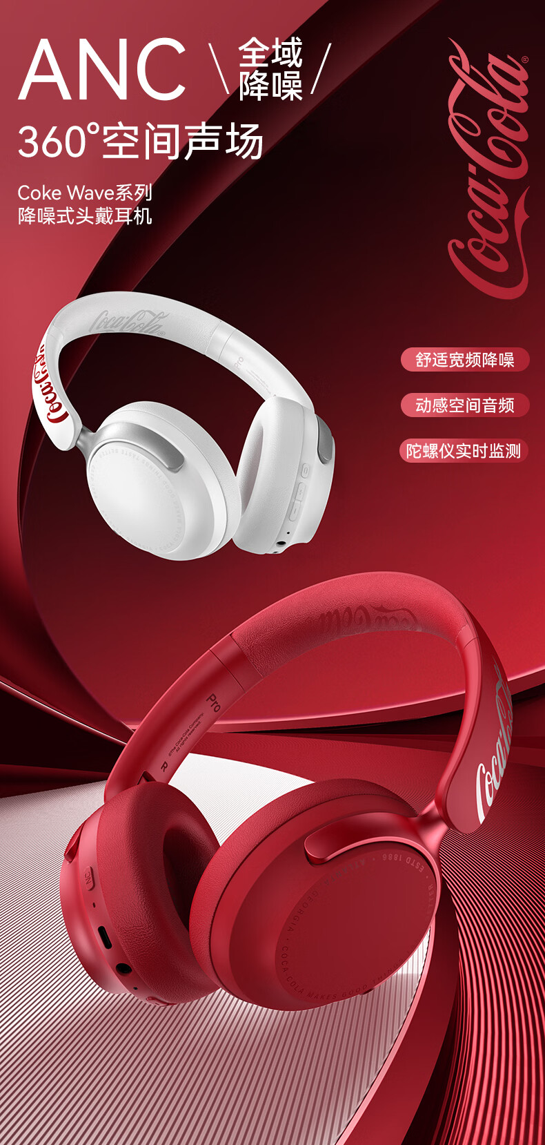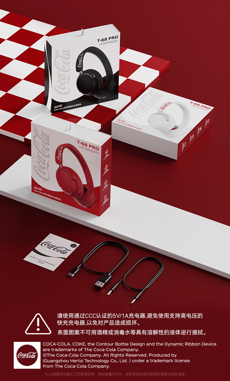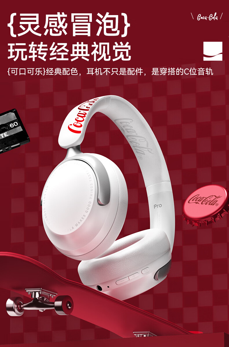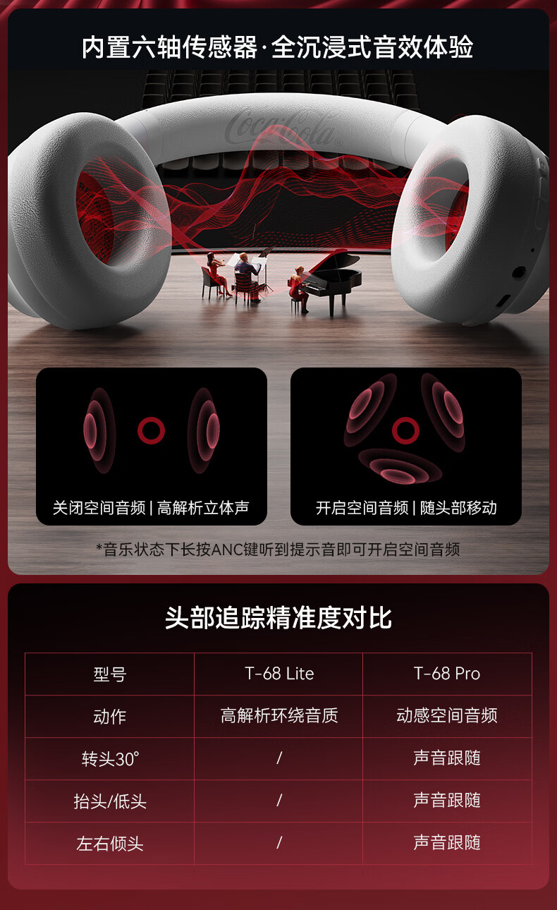 可口可乐【2026最新款丨旗舰顶配】T-68 Pro蓝牙耳机头戴式主动降噪空间音频游戏电竞运动无线长续航AI耳机