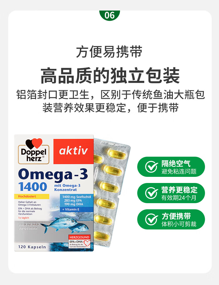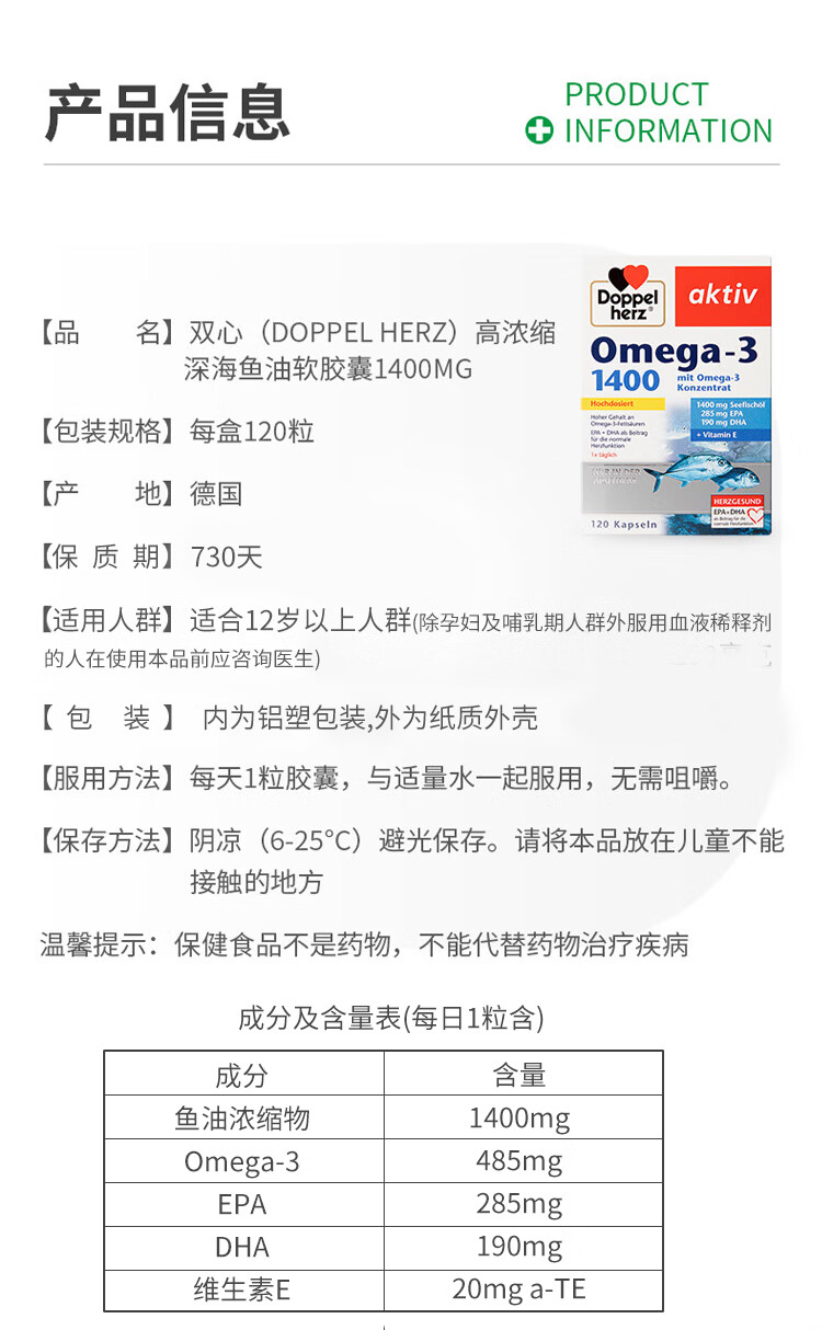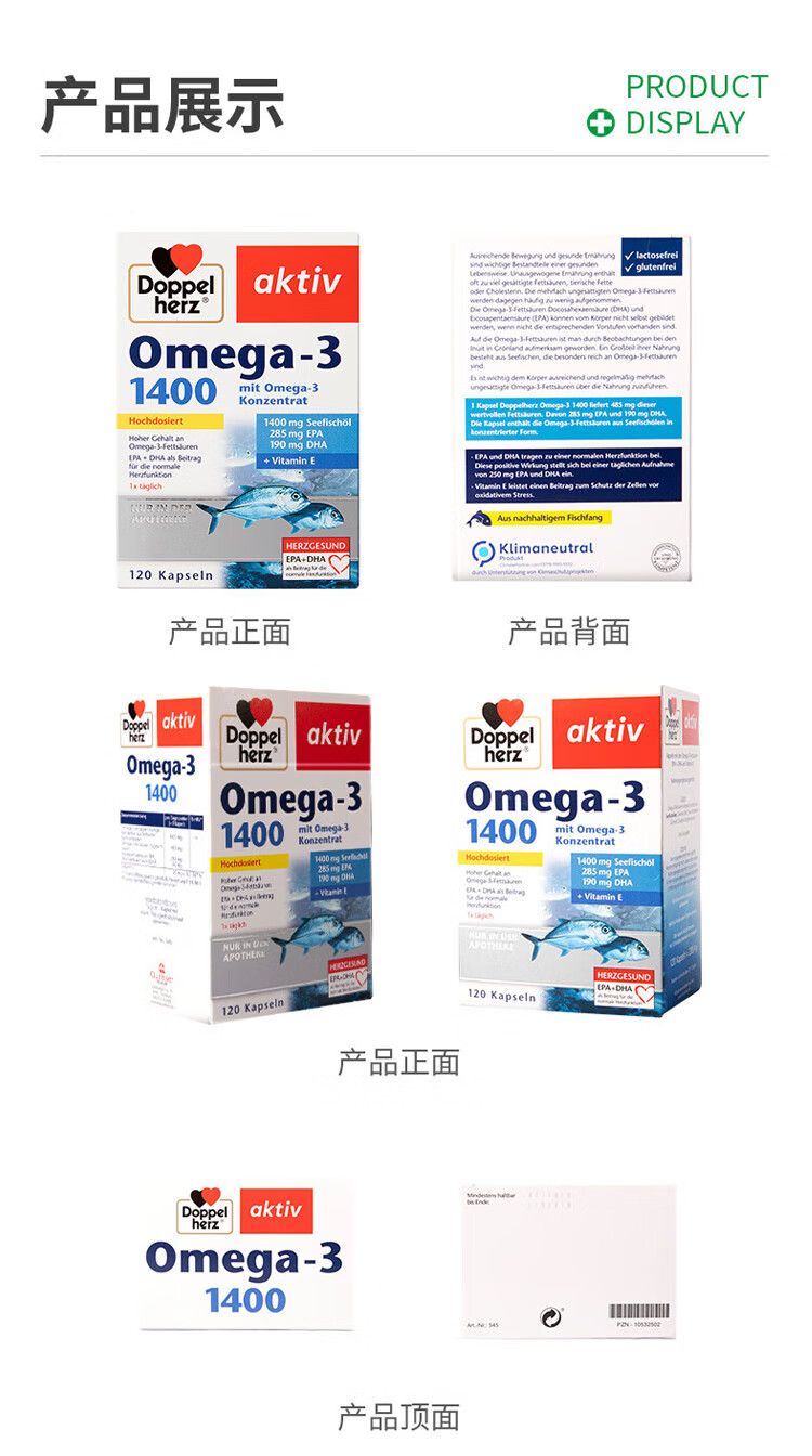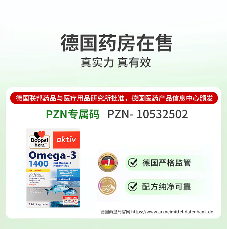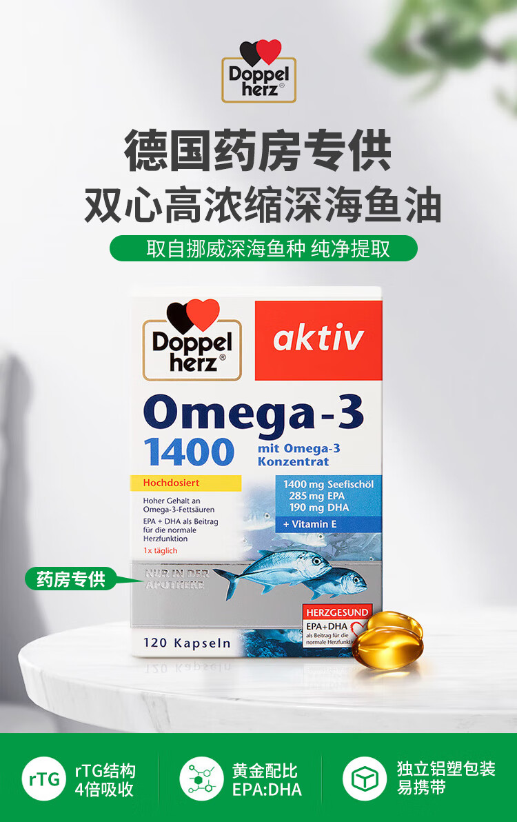 双心德国药房款1400深海鱼油omega-3软胶囊DHA EPA高浓缩鱼油120粒 【8.31到期】德国PZN认证 120粒*2盒