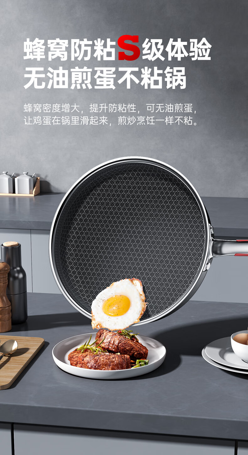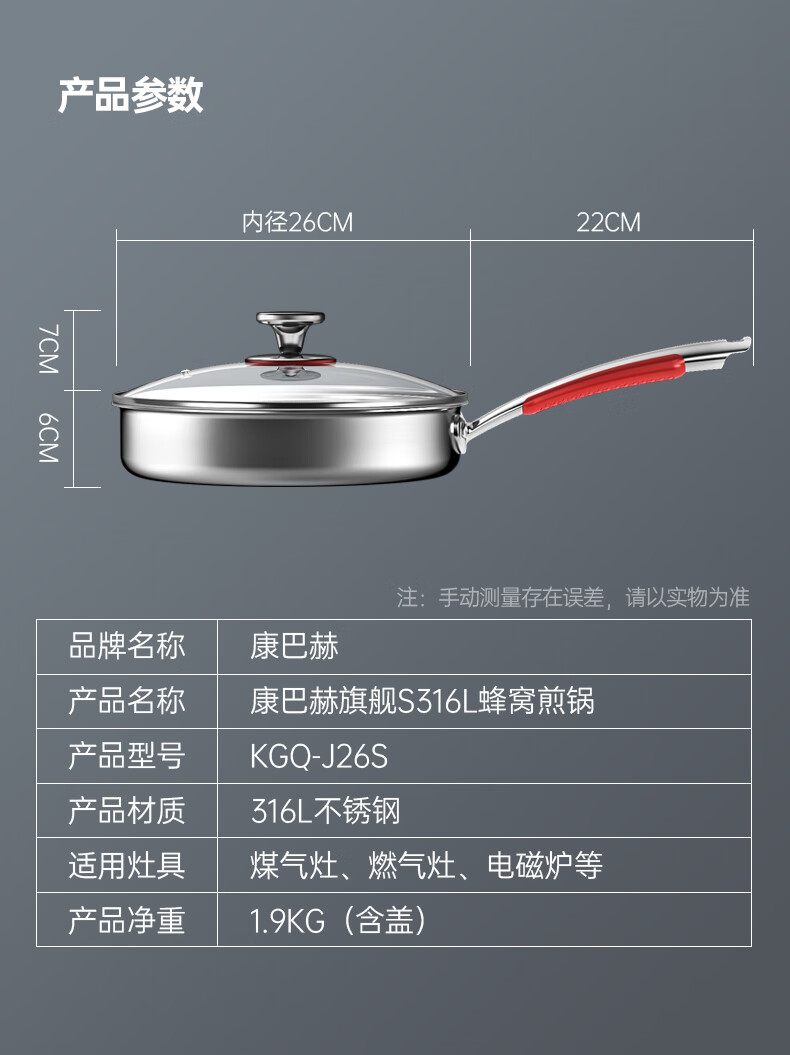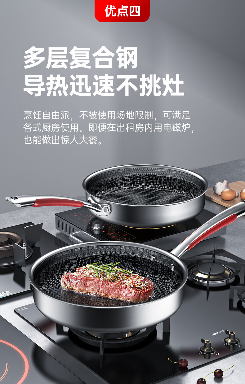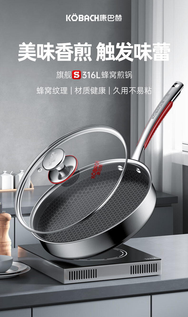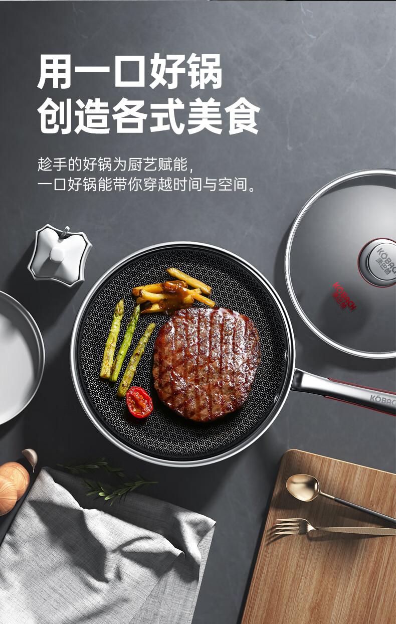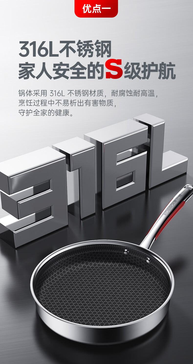 康巴赫旗舰S款316L不锈钢平底锅蜂窝家用煎牛排煎烙饼煎蛋不粘锅电磁炉