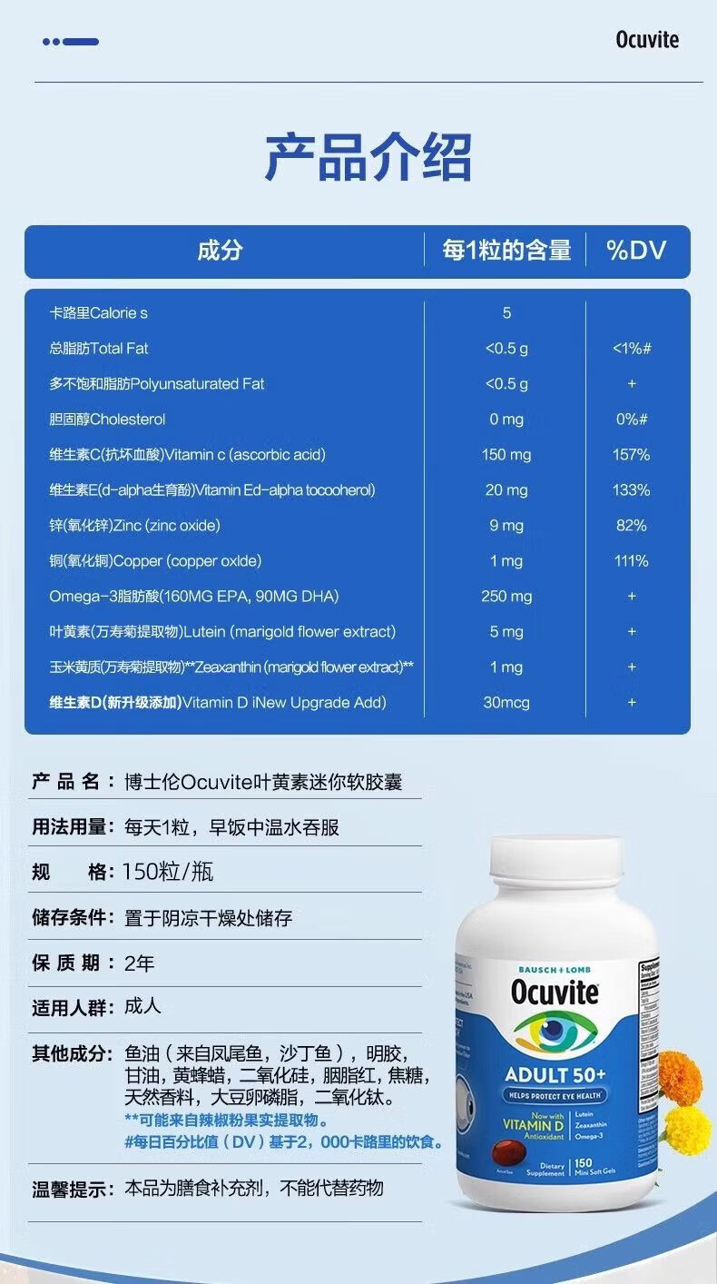 博士伦Bausch Lomb鱼油叶黄素成人进口软胶囊视力护眼150粒 香港免税溯源直邮2 150粒*2瓶